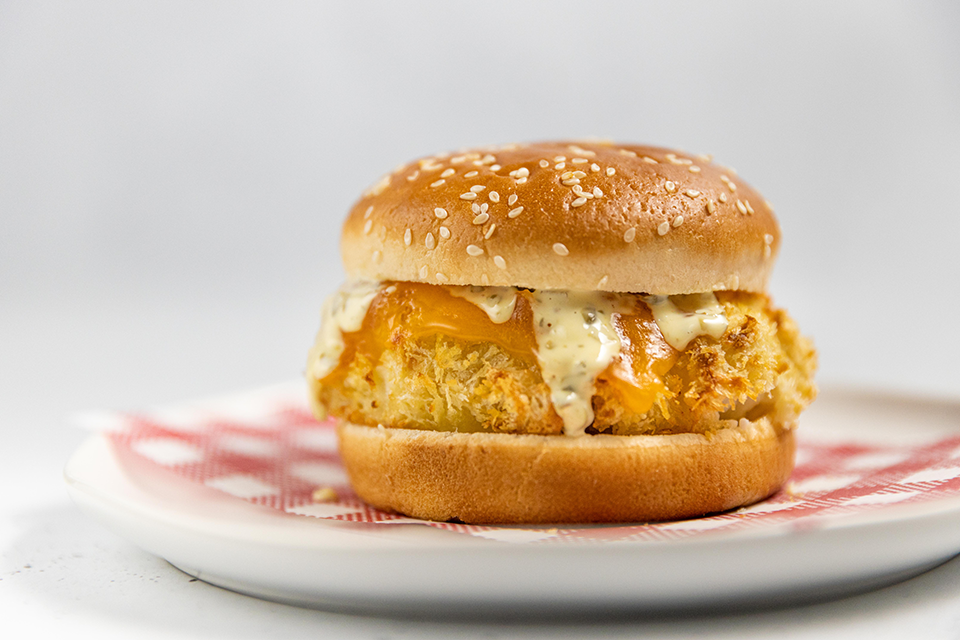 A golden-battered fish fillet, perfectly crispy and tender, served in a toasted brioche bun. Topped with zesty tartar sauce, fresh lettuce, and juicy tomato slices, it's a deliciously light yet satisfying option for any meal.